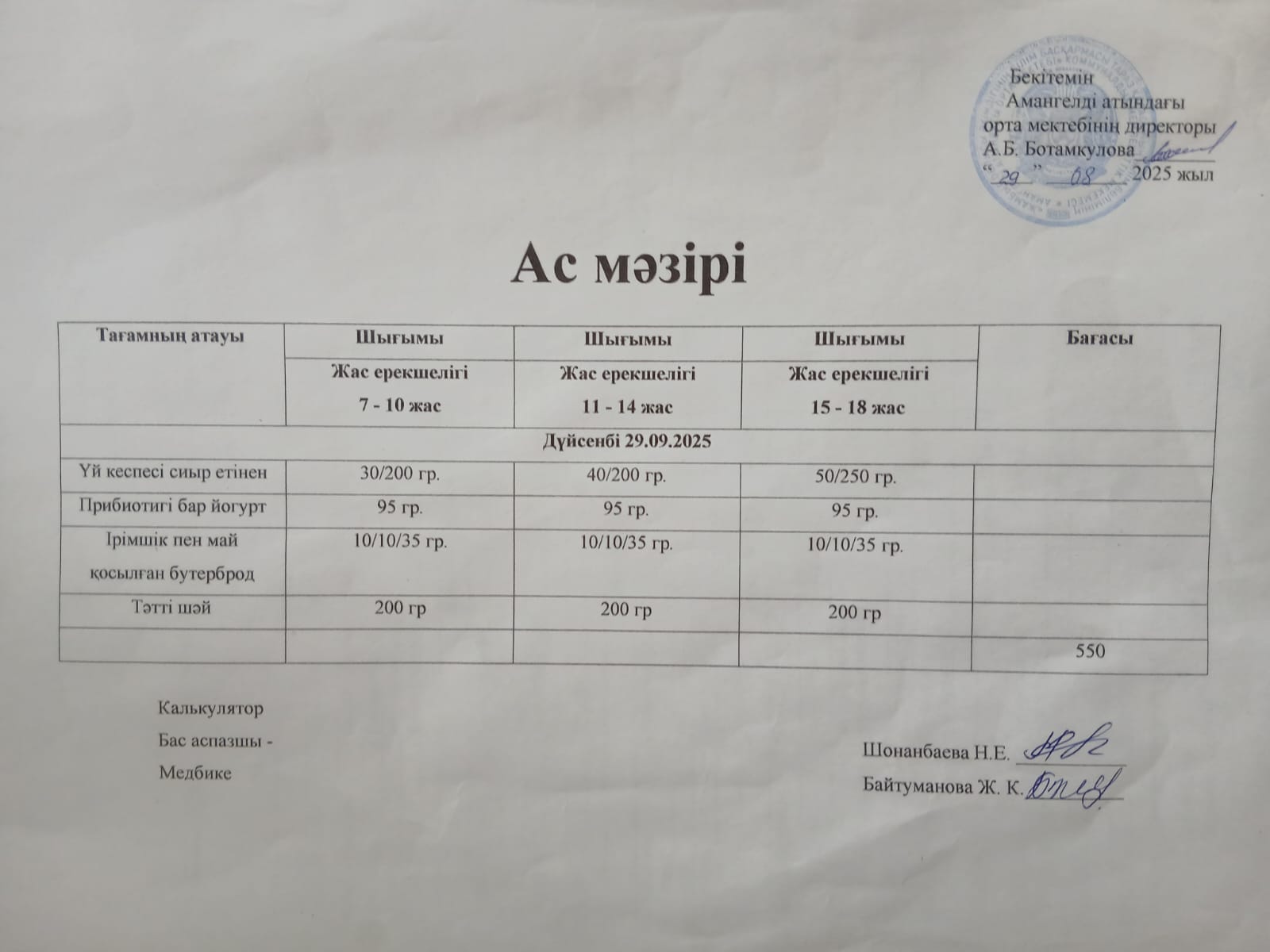 күнделікті ас мәзірі » Сш Амангелды