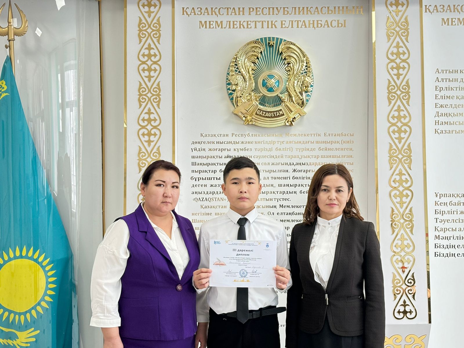 Жамбыл облысы әкімдігі білім басқармасының Тараз қаласы білім бөлімі ұйымдастыруымен "Ғылыми жоба" байқауының ІІІ дәрежелі дипломның иегері 7 "а" сынып оқушысы Мейрамбек Шаяхмет.