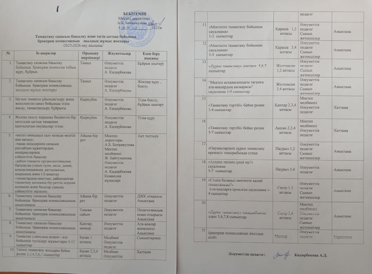 29 август 2025 0 1 2 3 4 5 Тамақтану сапасын бақылау және тегін ыстық тамақ бойынша бракераж комиссиясының жылдық жұмыс жоспары