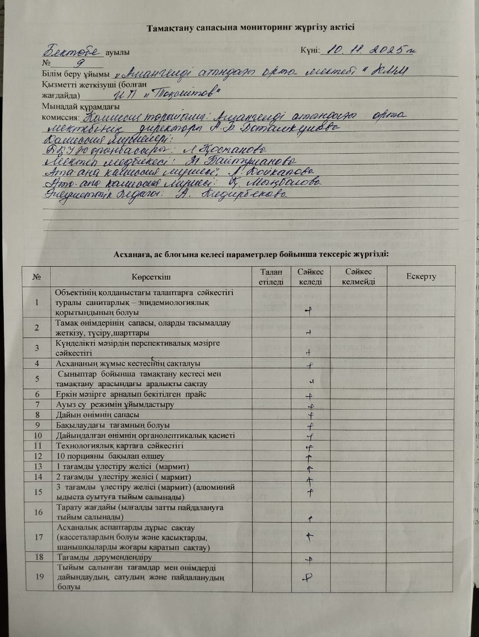 Тамақтану сапасына мониторинг жүргізу актісі №9 » Сш Амангелды